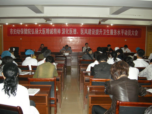 按照市卫生局党委部署,淮北市妇幼保健院于10月20日下午召开“弘扬大医精诚精神 深化医德医风建设提升卫生服务水平”主题活动动员大会。会议组织观看了卫生部“警钟长鸣”教育片;王子干同志作了大医精诚专题报告;对“弘扬大医精诚精神 深化医德医风建设 提升卫生服务水平”主题活动进行了全面部署。要求:1、严格按照活动方案落实,在全院掀起弘扬大医精诚精神、促进医德医风建设,提升卫生服务水平活动热潮;2、通过学习活动,有针对性的解决医院发展中出现的问题,树立正气,爱岗爱院敬业,不断提升技术服务质量,持续改进服务水平;3、主题活动要与当前“创先争优”活动、民评医院、争创价格诚信“十佳单位”相结合,不断推进医院发展,以保证此次活动圆满完成。